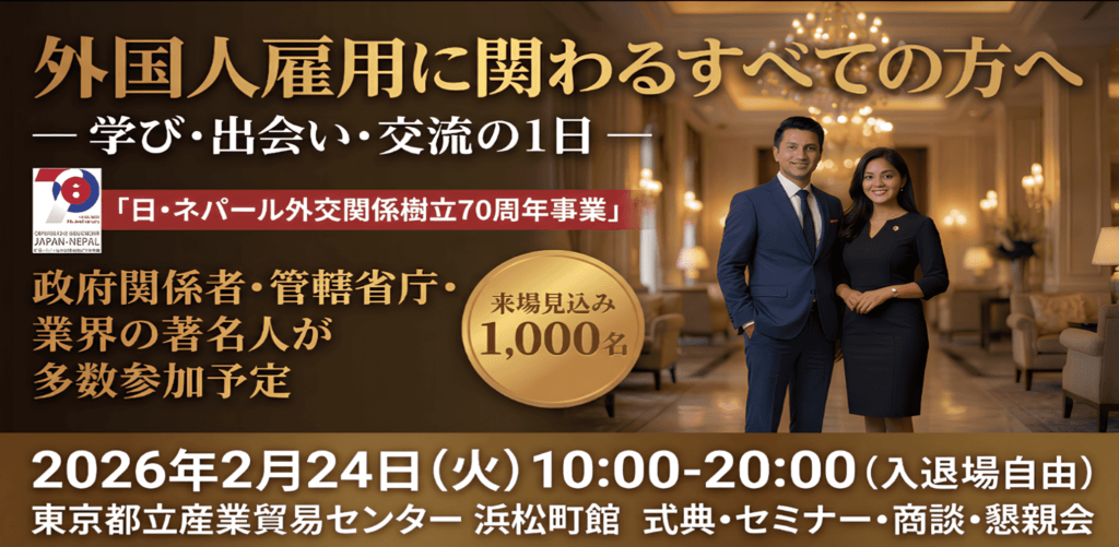 ネパール関係者だけではなく、日本からも外国人雇用に関する豪華来賓が出席予定で、情報収集交流の大きなチャンスとなります。