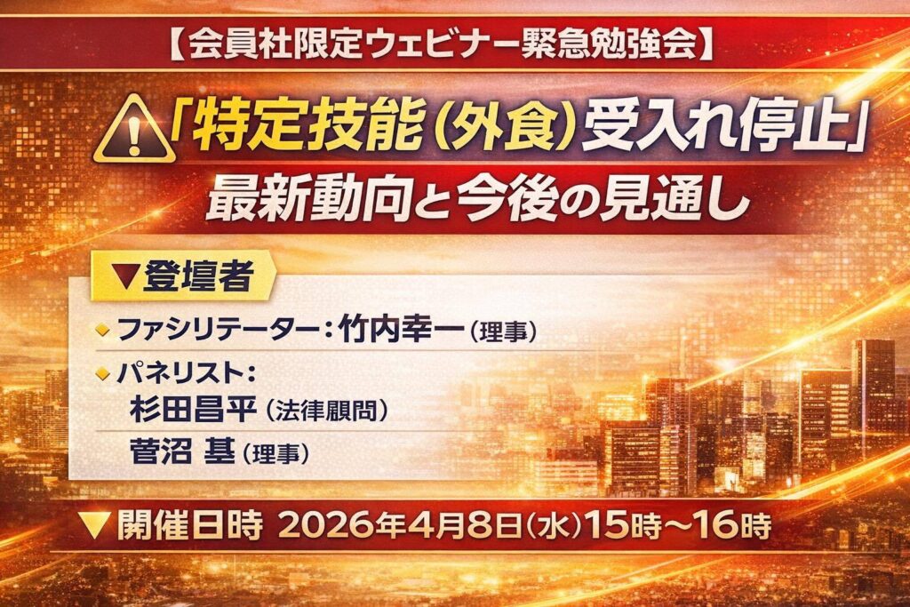 2026年4月8日、一般社団法人外国人雇用協議会主催により、会員企業限定の緊急勉強会「特定技能(外食)受入れ停止」最新動向と今後の見通しを開催いたしました。